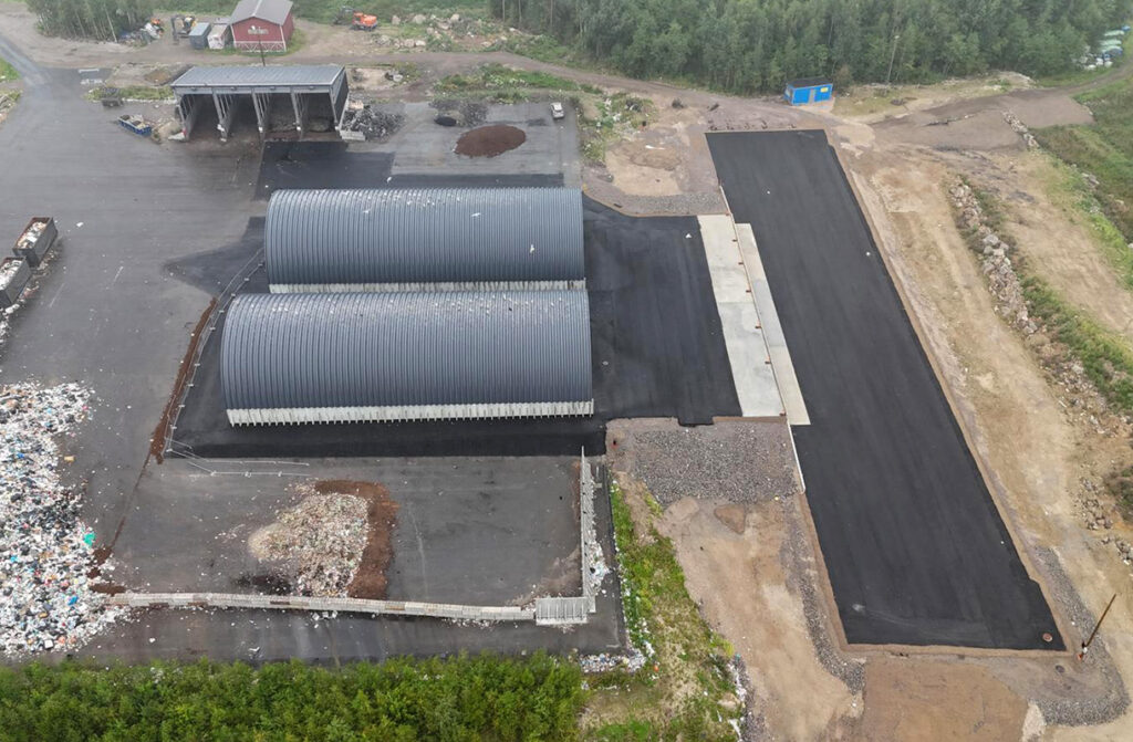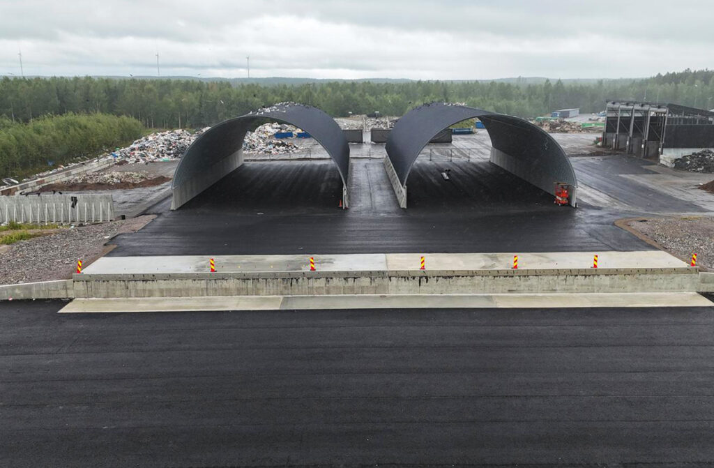 “Meille rakennettiin kaksi samanlaista hallia, jotka sijoitettiin vierekkäin. Hallit ovat molemmista päistä auki – toisesta päästä jätekuorma puretaan ja toisesta jätettä lastataan koneella kontteihin”, Ruuska kuvailee.